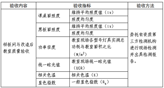 1.中標供應(yīng)商需在每所擬改造的學校內(nèi)選取其中1間普通教室進行樣板間施工改造,改造后由有資質(zhì)的第三方檢測機構(gòu)按表2的驗收指標進行樣板間教室照明質(zhì)量檢測,檢測合格后方能對其他教室進行改造。全部改造完成后按驗收抽樣原則抽取教室再次進行教室照明質(zhì)量檢測。